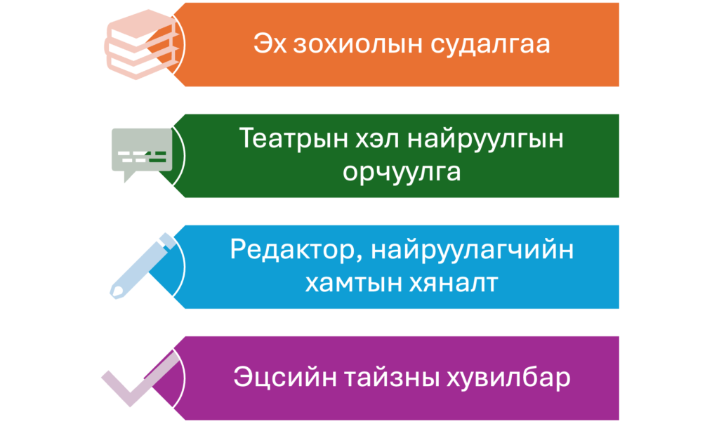 Бид зохиогчийн эрхийг хүндэтгэн, театрын мэргэжлийн стандартад нийцсэн лиценз, орчуулгын үйлчилгээ үзүүлнэ..